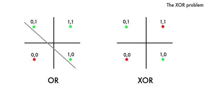 Два, в качестве показательного примера такой задачи подаётся проблема XOR. В то время как моделирование нейросетями логических функций – это то, с чего начали кибернетики в лице МакКаллока и Питтса, для практических применений никакого значения эта задача не имеет. То есть пример не показательный, а натянутый.