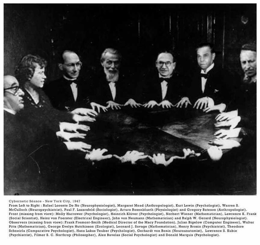 По официальной истории кибернетики началось всё с конференций Мейси – череды встреч выдающихся научных деятелей, которые, в обсуждениях друг с другом, и договорились до оснований кибернетики. Вот фото “кибернетического сеанса” с одной из первых конференций.