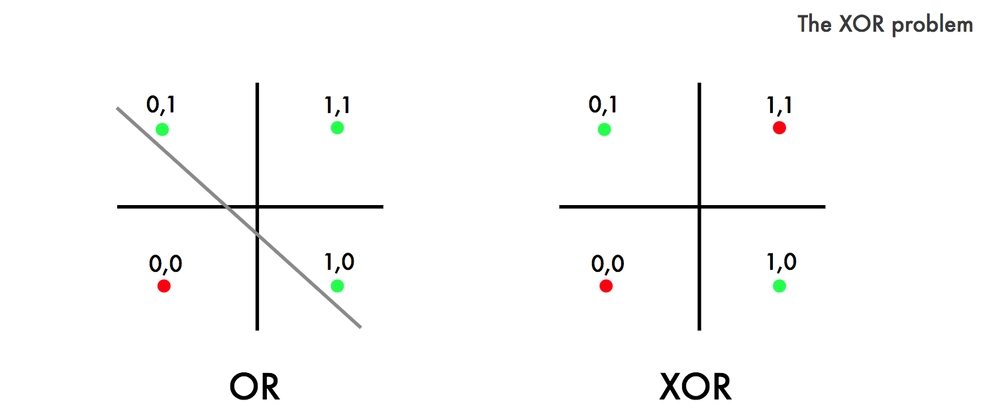 Одновременно эта картинка – забавный пример того, что один “линейный нейрон” (т.е. нейрон, который работает на основе линейной функции – в задачах классификации буквально пытается построить такую разделяющую прямую) не может смоделировать функцию XOR, “исключающего или” (именно она изображена в правой части рисунка).
