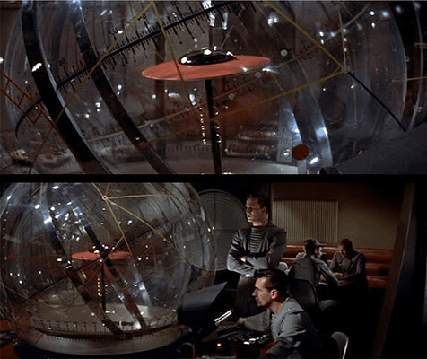 «Запретная планета» — один из ярких представителей американской кинофантастики 1950-х годов, оказавший определяющее влияние на развитие жанра. Создатели, якобы, вдохновлялись пьесой “Буря” Уильяма Шекспира. Это был первый фильм, где зрителю предлагалось почувствовать себя на другой планете, что породило целый жанр фантастического кино, вплоть до “Аватара”. Первые космонавты используют очень интересный механизм навигации между звезд: так называемый астромат, который находится на командирском мостике звездолёта и обращен к иллюминатору. В пределах легкой досягаемости слева и справа расположены похожие друг на друга настольные панели концентрически расположенных кнопок. Модель космического корабля C-57D находится в центре прозрачного глобуса, который вращается, в свою очередь, внутри другого прозрачного шара. Поверхность внутреннего глобуса подробно украшена градуированным кольцом вокруг экватора, полумеридианами, простирающими от полюсов, и рядом других бессмысленных градаций. Внешний, неподвижный глобус имеет на поверхности знаки, которые, судя по всему, описывают звезды и крупные созвездия в виде точек и линий.