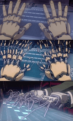 Помимо нейроинтерфейса в затылке, многие персонажи в «Призраке в доспехах» обладают особой кибернетической аугментацией, которая позволяет им использовать специально разработанные клавиатуры для ввода данных. Чтобы управлять этим устройством, верхние конечности пользователя заменены на кибернетические. В обычном состоянии они выглядят и ведут себя как нормальные человеческие руки, но при необходимости каждый палец этих рук разделяется на три отдельных мини-пальца, способные двигаться независимо друг от друга. Эти 30 паукообразных пальчиков утраивают количество задействованных клавиш, танцуя по клавиатуре с ослепительной скоростью 24 позиции в секунду.