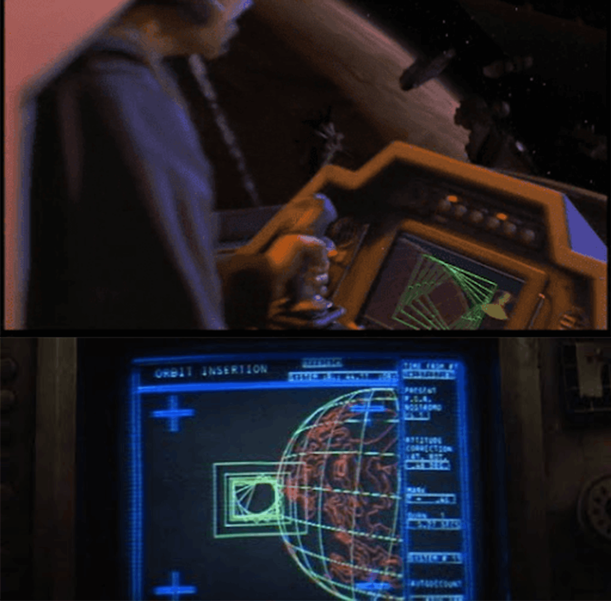 Еще более забавной выглядит система навигации для пилотов: наложенный на экран набор зеленых прямоугольников, скручивающихся друг относительно друга, в зависимости от состояния полёта и расположения небесных тел вокруг корабля. Они обеспечивают пилоту идеальную траекторию, когда он уже приближается к земле. Совершенно непонятно, как это работает, да и в реальном мире интерфейсы-прямоугольники не используются!