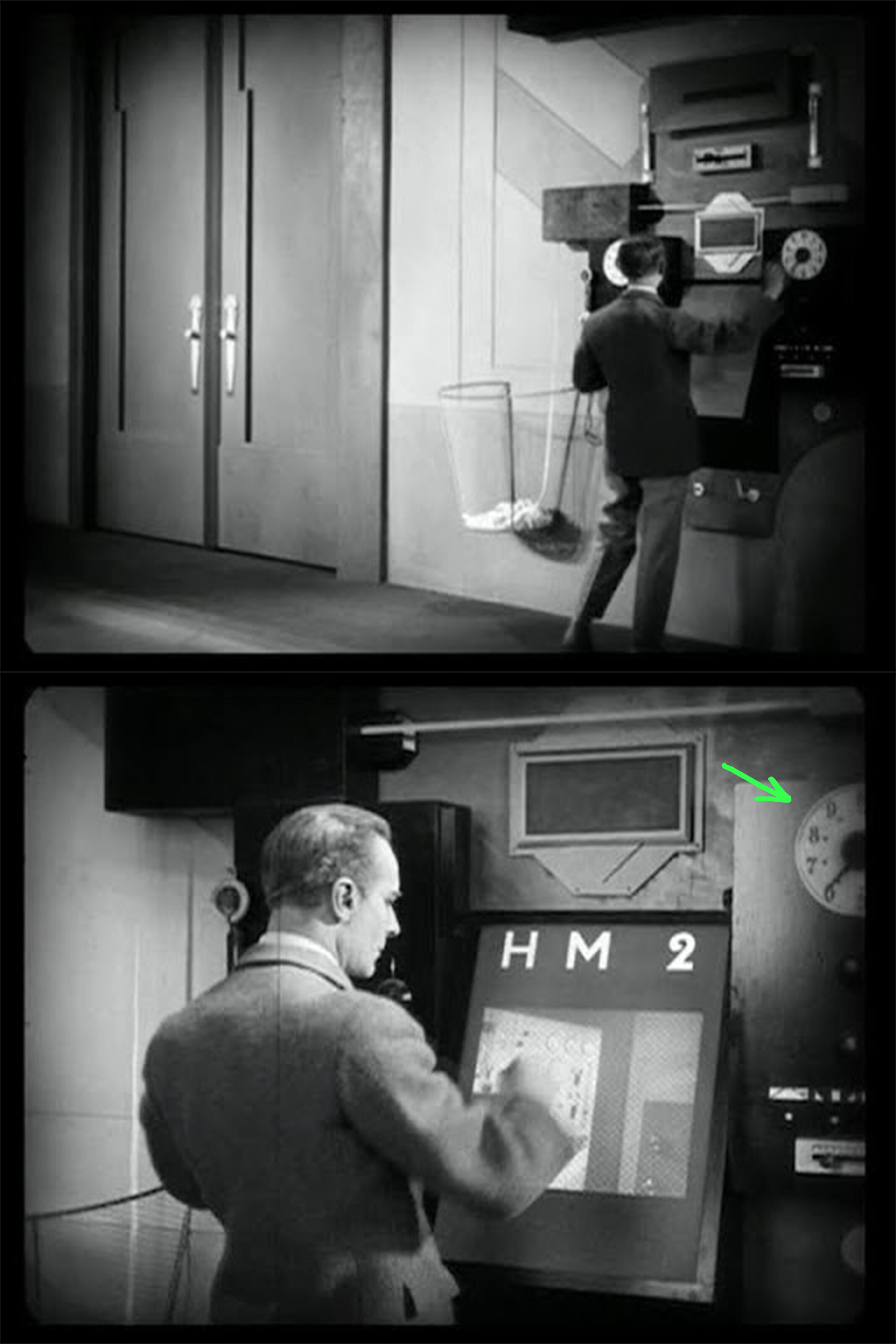 Классический фильм Метрополис 1927 года вошел в историю благодаря первому образу женщины-робота, однако тут гораздо больше любопытного для историка технологий. Самым впечатляющим интерфейсом фильма был видеофон Джо Фредерсона, главного мастера города. Пользователю приходилось крутить ручку-роутер, чтобы связаться с собеседником, и это хороший пример того, что, даже заглядывая в будущее, фантаст должен основывать свои интерфейсы на паттернах, уже знакомых зрителям. Видеофон работал на принципе прокручивания циферблата: главный герой поочередно прокручивал ручки инструмента. Дойдя до правого диска, герой поворачивает руку против часовой стрелки, указывая на номер 10, а потом на номер 6. А левой рукой он поворачивает реле в положение 4, и экран оживает. Магия!
