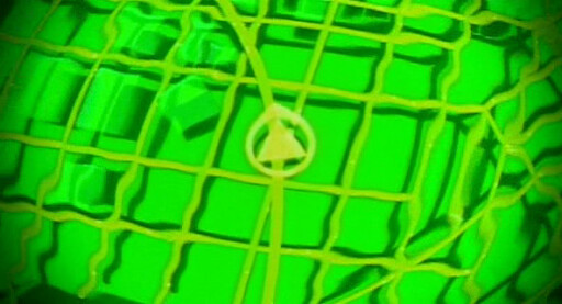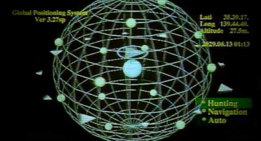 И снова мы наблюдаем другой режим работы с визуализацией. Аналитики применяют её, чтобы определить местоположение нужной машины. Первые экраны, которые они видят, показывают большой глобус с белой градусной сеткой и наложенной надписью «Global Positioning System Ver 3.27sp». По глобусу размещены точки разного размера. Затем появляются треугольники вместе с наложенной информацией о широте, долготе и высоте. В правом нижнем углу возникают три другие опции: «Hunting», «Navigation» и «Auto». Опция «Hunting» выделена полупрозрачным прямоугольником ярко-зелёного цвета. Должно быть, это показывает нам мощ глобальной системы слежения Секции 9: как-то странно охотиться на мусоровоз по всему земному шару.