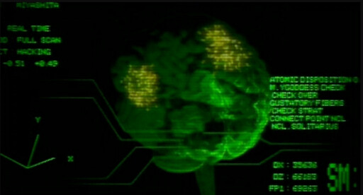 Вокруг изображения мозга находится легенда, но видно, что это бутафория: значения в верхнем левом углу никогда не меняются, а значения в нижней легенде меняются слишком быстро, чтобы их успеть прочитать. Через пару секунд справа на экране появляется текстовый оверлей с расплывчато-медицинскими терминами, написанными заглавными буквами и пролетающими слишком быстро, чтобы их прочесть. В углу кадра виден дополнительный прибор с индикаторами в стиле прогресс-баров — толстые зелёные линии колеблются влево-вправо. Над ним висят две волновые формы, их метки выходят за пределы кадра. Жёлтые «фейерверки» появляются возле «висков» мозга, указывая на атакуемые участки.