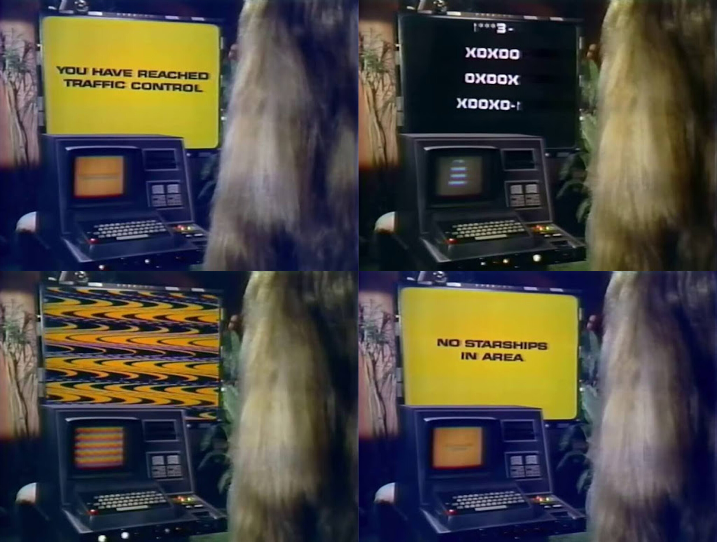 Когда Малла (девушка Чубакки) задается вопросом о местонахождении своего волосатого бойфренда, она обращается к имперскому компьютеру. Устройство находится в жилом помещении и состоит из персональной консоли и большого стенного дисплея. На консоли есть QWERTY-клавиатура, четыре набора, два датчика, считыватель карт, несколько красных и зеленых лампочек сбоку и ряд случайно-мигающих белых фонарей спереди. Когда Малла подходит к устройству, оно отображает 8-битный калейдоскоп и играет звук стандартной электроники. Малла нажимает на несколько кнопок - здесь важно заметить эргономику взаимодействия с машиной. Как это выглядит? Она нажимает пять кнопок и ждет несколько секунд. Потом она нажимает еще четыре кнопки и на экране появляется: строка из 22 символов (пароль? Обозначение канала?) ↑ *** 3- ↓ 3 и 39 ÷ ↑% 63 & - ::: ↓ после чего экран мигает. YOU HAVE REACHED TRAFFIC CONTROL черными буквами на желтом фоне.
